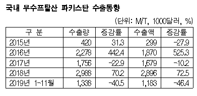 파키스탄이 한국산 무수프탈산(Phthalic Anhydride)에 대한 반덤핑 조사에 나섰다. 표, 그래프: <국내 무수프탈산 파키스탄 수출동향> <화학저널 2020/01/02> |