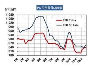 표, 그래프: <PA 가격동향(2019)> <화학저널 2020/01/02> |