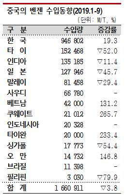 중국이 벤젠(Benzene) 수입을 줄이고 있다. 표, 그래프: <중국의 벤젠 수입동향(2019.1-9)> <화학저널 2020년 1월 6일> |
