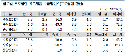 글로벌 프로필렌 유도제품 수요는 연평균 3.3% 증가할 것으로 판단해 2017년 전망에 비해 0.1%포인트 하향 조정했다.