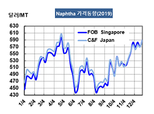 표, 그래프: <Naphtha 가격동향(2019)> <화학저널 2020/01/03> |