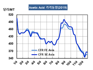 표, 그래프: <Acetic Acid 가격동향(2019)> <화학저널 2020/01/03> |