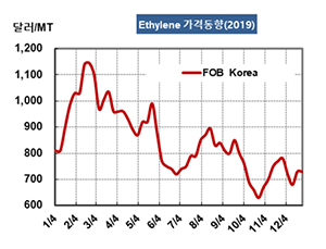 아시아 에틸렌 시장은 2019년 내내 다운스트림 침체의 영향에서 벗어나지 못해 2월 1100달러를 넘어섰을 뿐 하락추세를 막지 못했다.
