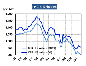 표, 그래프: <PP 가격동향(2019)> <화학저널 2020/01/07> |