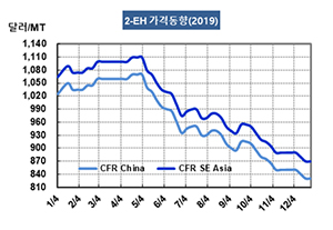 표, 그래프: <2-EH 가격동향(2019)> <화학저널 2020/01/10> |