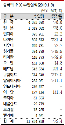 P-X(Para-Xylene)는 2019년 글로벌 수요가 전년대비 3% 증가하는데 그친 것으로 추정된다. 표, 그래프: <중국의 P-X 수입실적(2019.1-9)> <화학저널 2020년 1월 13일> |
