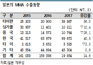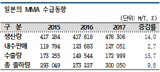 일본 석유화학공업협회에 따르면, 일본은 2017년 MMA 생산량이 47만6306톤으로 전년대비 14% 증가했고 내수 거래량은 12만7051톤으로 2.7% 늘어나며 2016년에 이어 2년 연속 증가세를 유지했다.