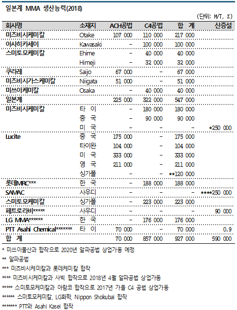 일본공장, 한국 합작기업, 싱가폴 등에서 MMA를 생산하고 있으며 사우디에서도 2018년부터 합작기업을 통해 MMA 플랜트를 가동하고 있다.