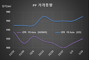 PP(Polypropylene)는 전 그레이드가 10달러씩 상승했다.