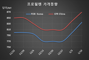 프로필렌(Propylene)은 800달러대 중반으로 급등했다.