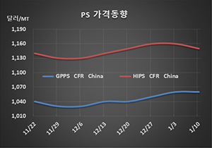 PS(Polystyrene)는 고충격 그레이드만 하락했다.