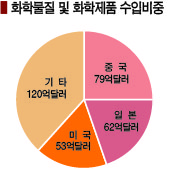표, 그래프: <화학물질 및 화학제품 수입비중, 한국·일본의 중간재 중국 수출, 한국·일본의 중간재 중국 수출(반도체 제외)> <화학저널 2020년 1월 20·27일> |