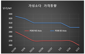 가성소다 시세는 1월16일 FOB NE Asia 톤당 260달러로 10달러 하락했으나 CFR SE Asia는 300달러로 변동이 없었다. 표, 그래프: <가성소다 가격동향> |