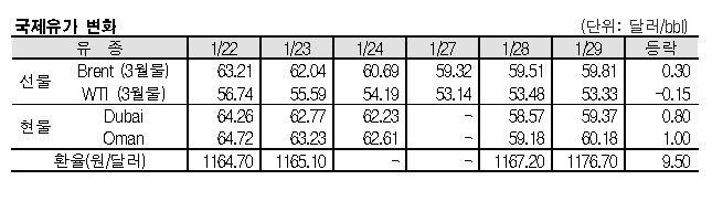 1월29일 브렌트유(Brent)는 후티반군의 사우디 석유 생산설비 공격 발표 영향으로 상승했다. 1월29일 국제유가는 사우디 석유 생산설비 피격 영향으로 상승했다. 표, 그래프: <국제유가 변화> <화학저널 2020/01/30> |