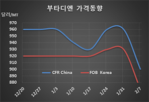표, 그래프: <Butadiene 가격동향> <화학저널 2020/02/11> |