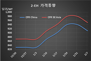 표, 그래프: <2-EH 가격동향> <화학저널 2020/02/14> |