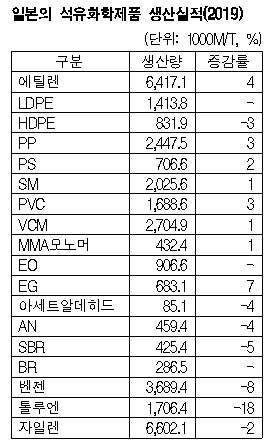 일본은 에틸렌(Ethylene) 생산량이 642만톤에 육박하는 수준으로 증가했다. 표, 그래프: <일본의 석유화학제품 생산실적(2019)> <화학저널 2020/02/17> |