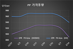 표, 그래프: <PP 가격동향> <화학저널 2020/02/18> |