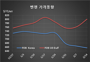 벤젠 시세는 2월14일 FOB Korea 톤당 656달러로 10달러 하락했고 FOB SE Asia 역시 638달러로 12달러 떨어졌다. 특히, CFR Taiwan은 665달러로 20달러, CFR China는 664달러로 17달러 하락했다.