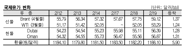 2월19일 국제유가는 코로나19 영향 단축에 대한 기대 영향으로 상승했다. 2월19일 국제유가는 코로나19 영향이 단기에 그치고 조만간 회복될 것이라는 기대에 따라 상승했다. 표, 그래프: <국제유가 변화> <화학저널 2020/02/20> |