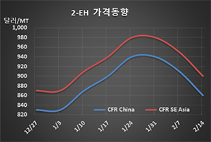 표, 그래프: <2-EH 가격동향> <화학저널 2020/02/20> |