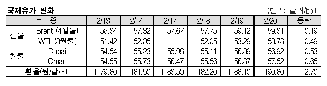 2월20일 국제유가는 미국의 원유 재고 증가폭이 소폭에 그친 영향으로 상승했다. 2월20일 국제유가는 미국의 원유 재고가 전망과 달리 소폭 증가하는데 그침에 따라 상승했다. 표, 그래프: <국제유가 변화> <화학저널 2020/02/21> |