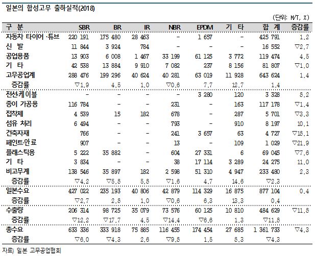 일본 경제산업성이 발표한 화학공업통계에 따르면, SBR(Styrene Butadiene Rubber)은 2018년 생산량이 57만9324톤으로 전년대비 6.4%, NBR(Nitrile Butadiene Rubber)은 11만3246톤으로 2.9% 감소했다.