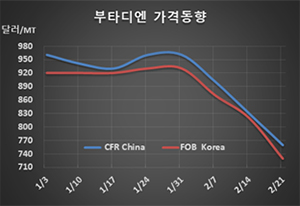 표, 그래프: <Butadiene 가격동향> <화학저널 2020/02/25> |