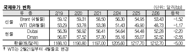 2월26일 국제유가는 코로나19의 세계적 대유행이 우려된 영향으로 하락했다. 2월26일 국제유가는 코로나19가 세계적으로 대유행할 것으로 우려됨에 따라 하락했다. 표, 그래프: <국제유가 변화> <화학저널 2020/02/27> |