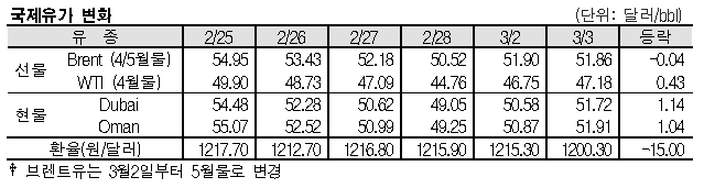 3월3일 브렌트유(Brent)는 코로나19에 따른 세계경제 침체 가능성이 계속된 영향으로 하락했다. 3월3일 브렌트유는 코로나19에 따른 세계경제 침체 가능성이 이어지면서 하락했다. 표, 그래프: <국제유가 변화> <화학저널 2020/03/04> |