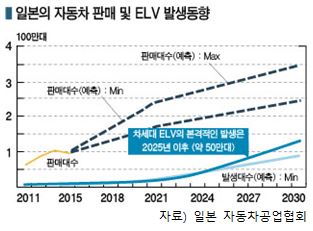 일본은 사용가능연수를 나타내는 내용연수 등에 따라 2025년 무렵부터 폐자동차(ELV)가 본격 발생해 2030년 약 100만대를 돌파할 것으로 예상하고 있으며 2차전지에서 회수되는 코발트 및 니켈도 연평균 총 1000톤에 달할 것으로 예측하고 있다.