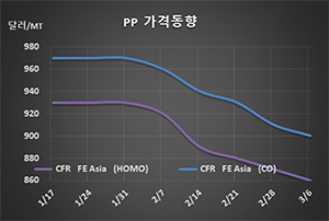 PP(Polypropylene)는 동북아시아 중심으로 하락했다.