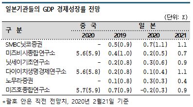 노무라(Nomura)증권은 중국에서 2월 말까지도 주요 도시들이 폐쇄된 상황이라는 점을 감안해 1분기 성장률 전망을 1.0%포인트, 2020년 성장률은 0.1%포인트 하향 조정했다. 특히, 1분기에는 일본을 방문하는 관광객 수는 물론 소비, 수출 모두 감소할 것으로 예상했다.
