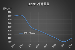 LLDPE 시세는 3월11일 CFR FE Asia 톤당 800달러로 10달러 상승했으나 CFR SE Asia는 810달러로 15달러 하락했다. CFR S Asia도 830달러로 15달러 하락했다.