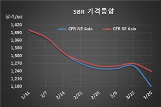 SBR 시세는 3월19일 CFR NE Asia 톤당 1180달러로 80달러 폭락했으나 CFR SE Asia는 1240달러로 30달러 하락에 그쳤다. 표, 그래프: <SBR 가격동향> |