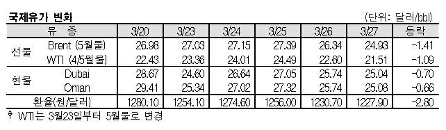 3월27일 국제유가는 코로나19에 따른 석유 수요 감소에 대한 우려가 계속되면서 하락했다.