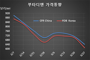 표, 그래프: <Butadiene 가격동향> <화학저널 2020/03/31> |