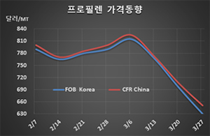 프로필렌 시세는 3월27일 FOB Korea 톤당 630달러로 65달러 폭락했고 CFR SE Asia는 610달러로 70달러 폭락했다. CFR China는 650달러로 55달러 폭락했다.