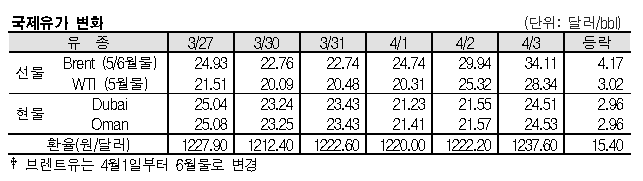 4월3일 국제유가는 OPEC(석유수출국기구)+의 긴급회의 영향으로 폭등했다. 4월3일 국제유가는 OPEC+ 긴급회의 개최 및 산유국들의 감산 합의 가능성에 영향을 받아 폭등했다. 표, 그래프: <국제유가 변화> <화학저널 2020/04/06> |