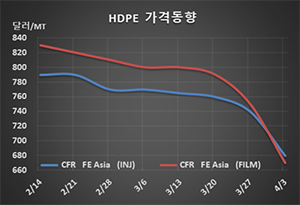 표, 그래프: <HDPE 가격동향> <화학저널 2020/04/06> |