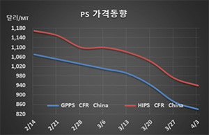 PS(Polystyrene)는 폭락세가 멈출지 주목된다.