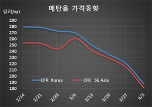 메탄올 시세는 4월3일 CFR Korea 톤당 188달러로 32달러 폭락했고 CFR SE Asia도 182달러로 32달러 폭락했다. 반면, CFR Taiwan은 187달러로 11달러 하락에 그쳤고, CFR India는 156달러로 16달러 급락했다.