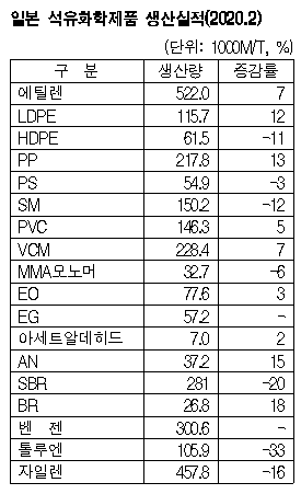 일본이 에틸렌(Ethylene) 가동률을 다시 높였다. 표, 그래프: <일본 석유화학제품 생산실적(2020.2)> <화학저널 2020/04/13> |