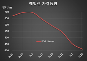 에틸렌 시세는 4월10일 FOB Korea가 톤당 410달러로 40달러 폭락했음에도 400달러대를 유지했으나 CFR SE Asia는 355달러로 65달러 폭락해 400달러가 무너졌다. CFR NE Asia는 410달러로 40달러 폭락했다.
