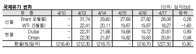 4월17일 브렌트유(Brent)는 미국 도널드 트럼프 대통령의 경제 정상화 계획 영향으로 상승했다. 4월17일 브렌트유는 미국의 경제 정상화 계획에 영향을 받아 상승했다. 표, 그래프: <국제유가 변화> <화학저널 2020/04/20> |