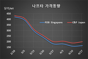 나프타 시세는 4월17일 C&F Japan 톤당 199달러로 11달러 상승했고 FOB Singapore은 164달러로 5달러 올랐다. FOB Rotterdam은 158달러, FOB USG는 148달러를 형성했다.