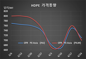 HDPE 시세는 4월22일 인젝션(Injection) 그레이드가 CFR FE Asia 톤당 710달러로 40달러 폭락했으나 CFR SE Asia는 700달러로 10달러 하락에 그쳤다. 블로우 몰딩(Blow-Molding)도 FEA는 720달러로 30달러 급락했으나 SEA는 700달러로 10달러 하락에 머물렀다. 필름(Film)은 FEA가 700달러로 60달러 폭락했고 SEA도 690달러로 30달러 급락했으며, 얀(Yarn)은 FEA가 720달러로 50달러 폭락했고, SEA는 700달러로 20달러 하락했다.