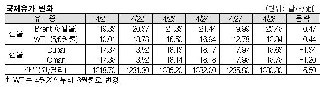 4월28일 브렌트유(Brent)는 일부 지역의 이동제한 조치 완화 영향으로 상승했다. 4월28일 브렌트유는 일부 지역의 이동제한 조치 완화를 계기로 석유 수요가 회복될 것이라는 기대 아래 상승세로 전환됐다. 표, 그래프: <국제유가 변화> <화학저널 2020/04/29> |