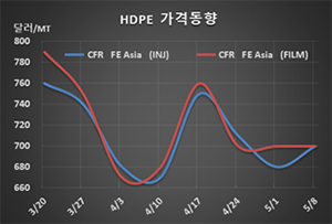 표, 그래프: <HDPE 가격동향> <화학저널 2020/05/11> |