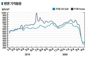 더군다나 브렌트유가 4월10일 31.48달러로 3달러 가까이 폭락했고 곧이어 30달러가 무너짐으로써 벤젠 현물가격도 300달러 아래로 미끄러질 것이 확실시되고 있다.